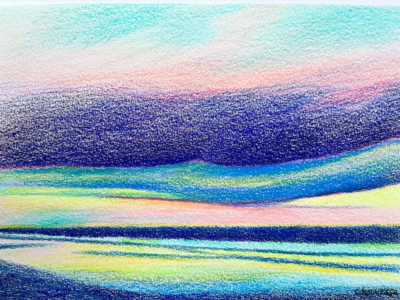 Layers of colored pencil create a textured landscape, where cool blues and purples meet pale greens and soft yellows. The marks evoke a sense of rippling water or distant hills shrouded in a dreamy, pastel light. It carries a calm, reflective undertone, inviting quiet contemplation.