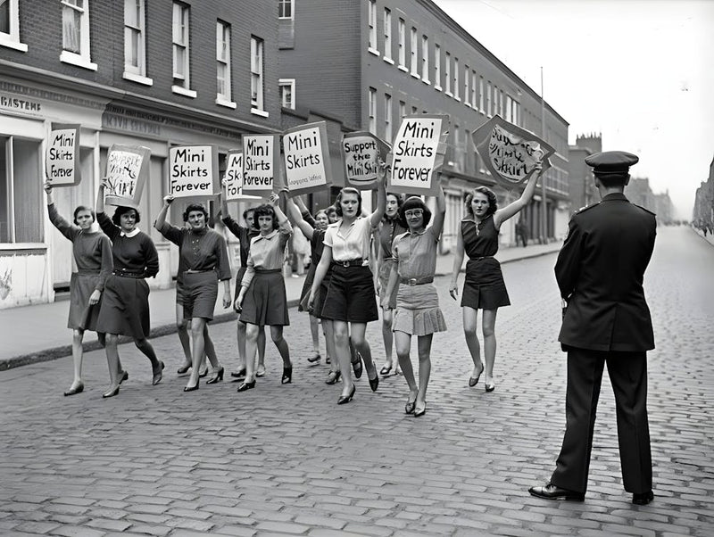 A defiant group of women parade down a cobbled street, proudly displaying 'Mini Skirts Forever' signs, challenging norms under the watchful eye of a lone policeman. This powerful black and white photograph captures a pivotal moment of fashion and feminist protest, radiating the bold, liberating spirit of the 1960s.