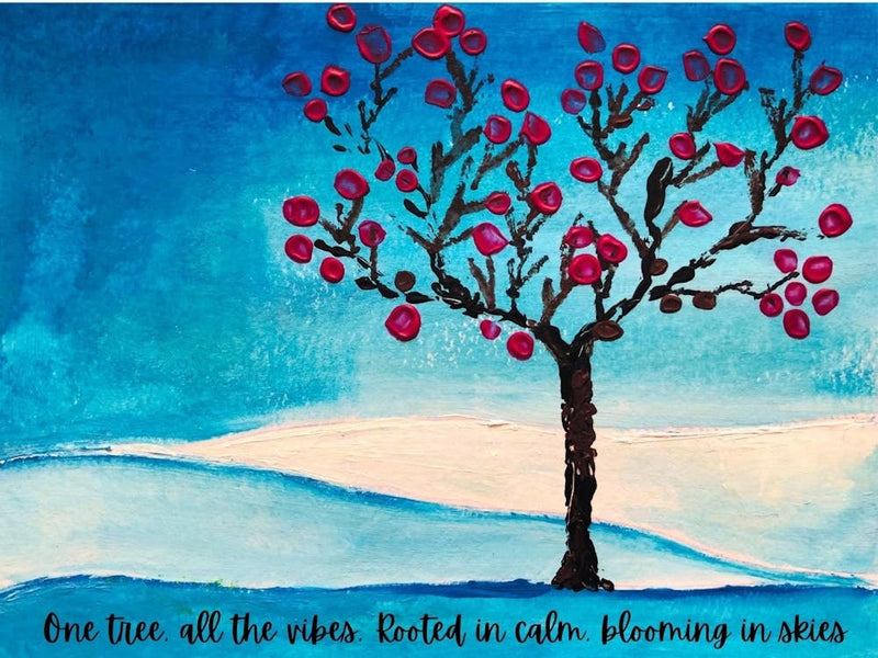 A single tree, bursting with vibrant red foliage, stands against a brilliant blue sky and serene, rolling hills. The accompanying hand-lettered quote infuses the scene with a gentle, positive energy. It's a sweet, comforting vision, celebrating simple beauty and inner calm in a charming, illustrative style.