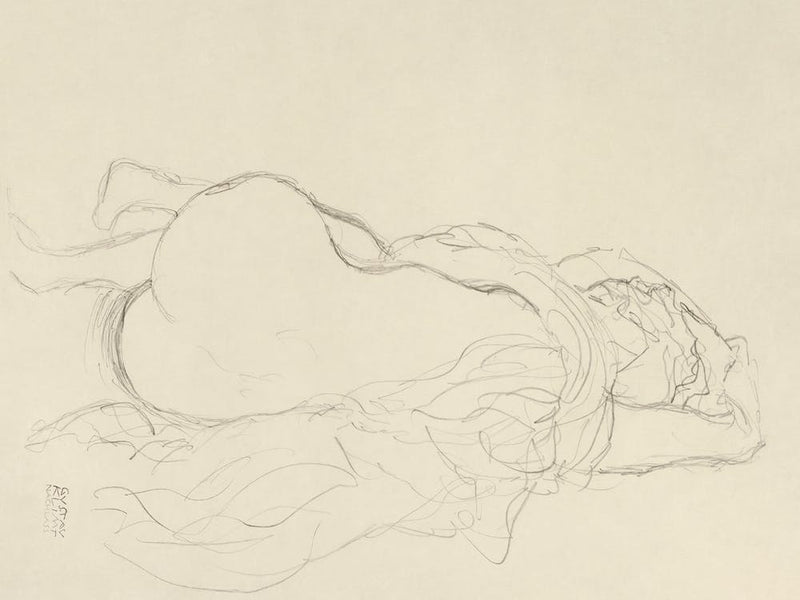 The soft, flowing lines of Gustav Klimt render a reclining nude, her form draped delicately in fabric. Seen from the back, the drawing emphasizes contour and repose, capturing a moment of quiet sensuality and classical elegance through the masterful touch of an artistic legend.