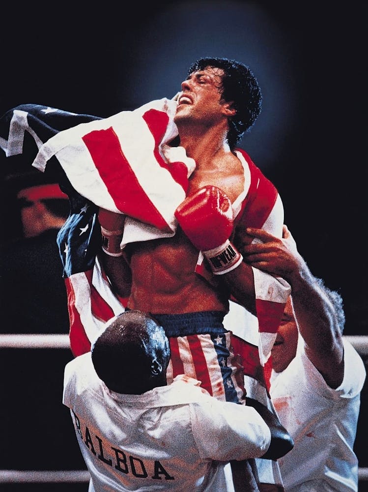 Clad in his iconic American flag shorts, Rocky Balboa is hoisted in triumph, his face etched with raw emotion and exertion. The image pulses with the energy of victory, a powerful testament to perseverance and the underdog spirit. It embodies an unforgettable cinematic moment, inspiring resilience and strength.