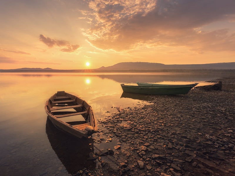 A breathtaking sunset paints the sky in fiery oranges and soft yellows, reflected in the still waters of a lake. Two small boats rest gently on the pebbled shore, silhouetted against the warm glow. This serene landscape captures a moment of tranquil beauty, evoking quiet contemplation and the peace of twilight.
