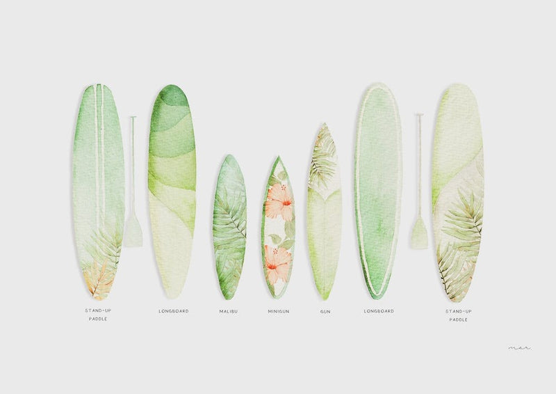A collection of surfboards stands upright on a serene beach, framed by swaying palm trees under a soft, hazy sky. The muted, sun-bleached greens and blues evoke a tranquil, Endless Summer vibe. It's a gentle invitation to coastal dreams, capturing the quiet anticipation before catching a perfect wave.