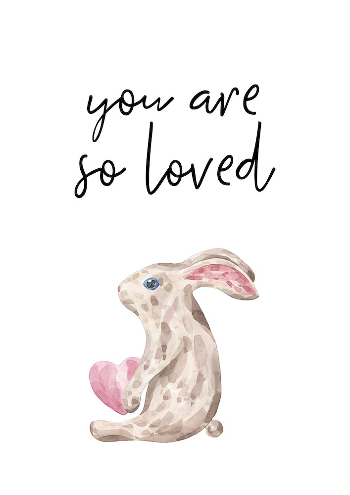 A charming watercolor bunny, rendered in soft brown and white, cradles a delicate pink heart. Above, the tender message 'you are so loved' floats in elegant script. This piece exudes warmth and innocence, a gentle whisper of affection perfect for a child's sanctuary.