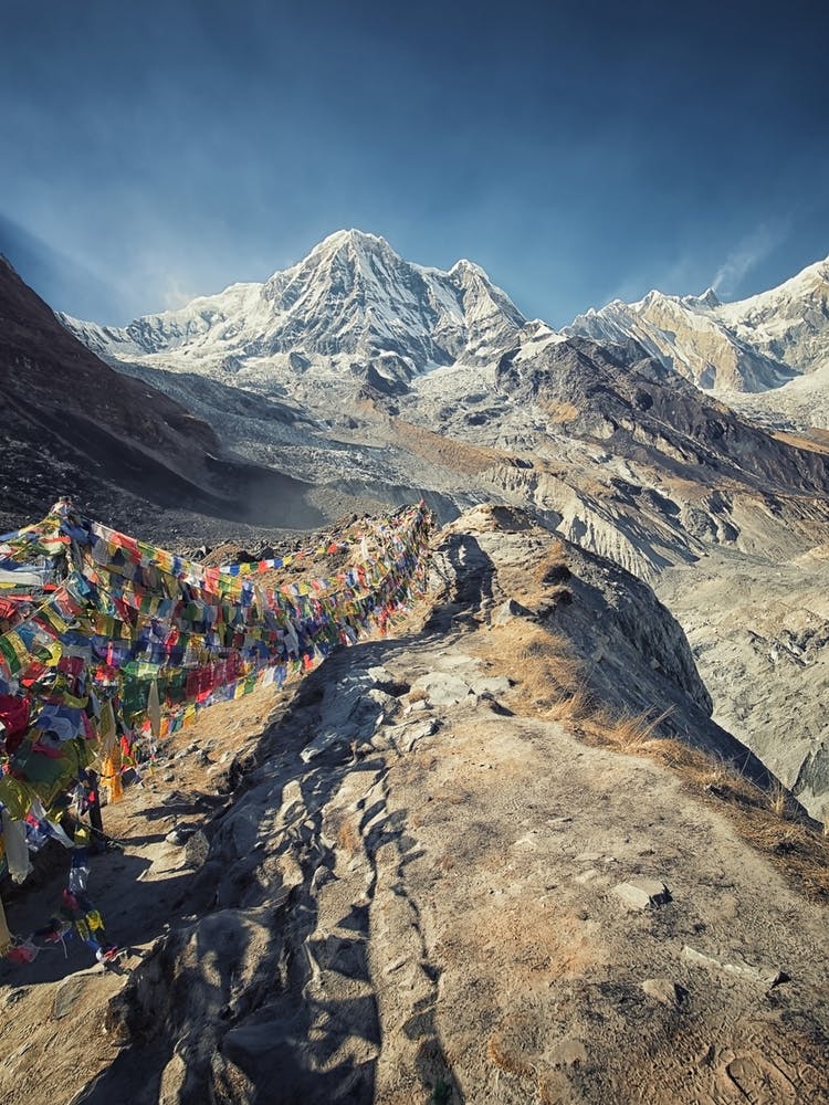 The majestic peaks of the Himalayas pierce a vast, blue sky, standing sentinel over a rugged, winding path. Colorful prayer flags flutter in the wind, infusing the raw mountainscape with spiritual resonance. This powerful image captures the humbling scale of nature and the enduring human spirit of exploration.
