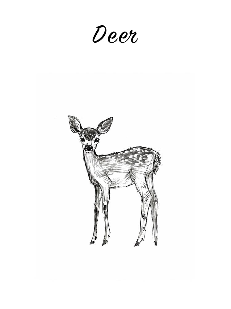 A gentle fawn, rendered in soft pencil strokes, stands poised and delicate against a crisp white background. Its innocence is captured in subtle shading and simple lines, evoking a quiet moment in nature. The drawing brings a sense of tender tranquility, perfect for a calming, natural-themed space.