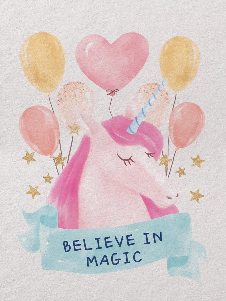 A gentle pink unicorn, with a delicate blue horn, floats among golden stars and soft balloons, beneath a banner proclaiming 'BELIEVE IN MAGIC.' Rendered in light watercolors, it conjures a world of gentle fantasy and pure, innocent wonder, perfect for sparking imagination.