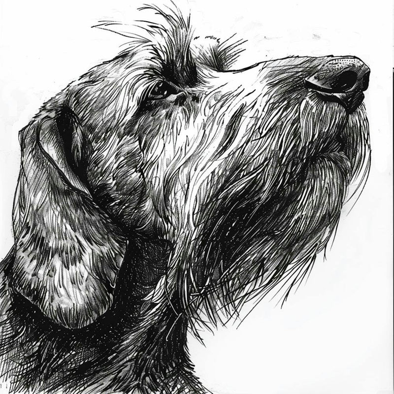 Intricate lines capture the endearing shagginess and soulful gaze of a Grand Basset Griffon Vendéen. Every stroke reveals texture and character, from the wispy fur to the curious tilt of its head. This monochrome sketch celebrates the loyal spirit and quiet dignity of a beloved canine companion.