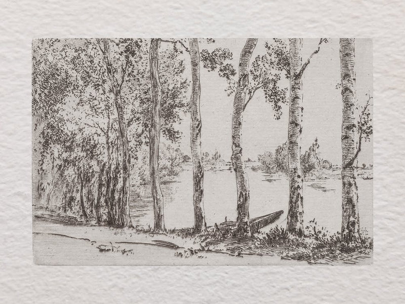A serene grove of slender trees stands tall by a tranquil body of water, rendered in fine monochrome lines. The delicate details of bark and leaves, alongside the still reflections, evoke a sense of quiet contemplation and enduring natural beauty. This piece carries a timeless, introspective charm.