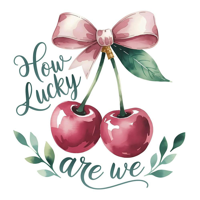 Two plump, watercolor cherries hang sweetly beneath a delicate pink bow, framed by fresh green leaves. The inviting script, 'How Lucky Are We,' flows with gentle elegance. It's a charming celebration of simple blessings, radiating warmth and heartfelt joy.