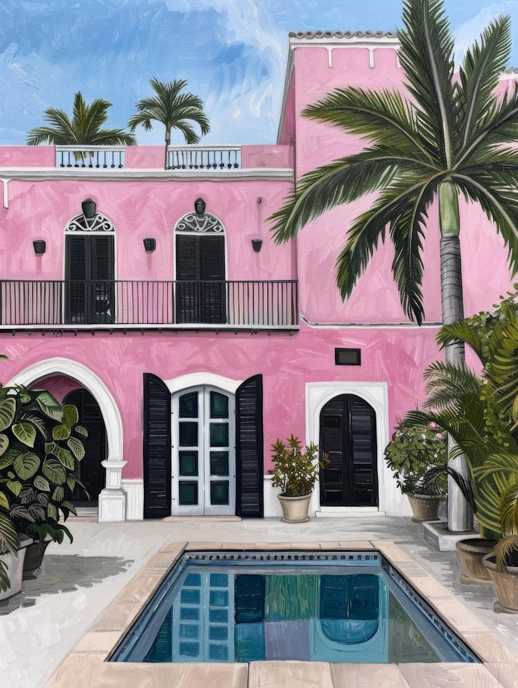 A magnificent pink villa, framed by swaying palms, overlooks a tranquil pool, inviting dreams of sun-drenched escapes. The vibrant facade and lush greenery create a striking visual contrast, evoking a sense of exotic luxury. This image captures the serene elegance of a tropical retreat, promising a moment of escape to an idyllic, sun-kissed paradise.