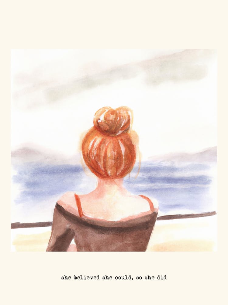 A solitary figure, seen from behind, gazes out at a tranquil, distant sea, her silhouette rendered in soft watercolors. Below, the gentle reminder "she believed she could, so she did" grounds the scene. The image evokes quiet strength and the power of personal conviction, inspiring calm and perseverance.