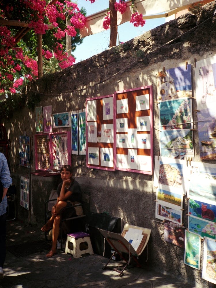 A sun-drenched alleyway reveals an outdoor art gallery, with vibrant artworks adorning stone walls. A lone figure sits observing the scene, adding a human element to the urban pulse. This piece captures the raw, expressive energy of street culture, with an undercurrent of creative freedom.