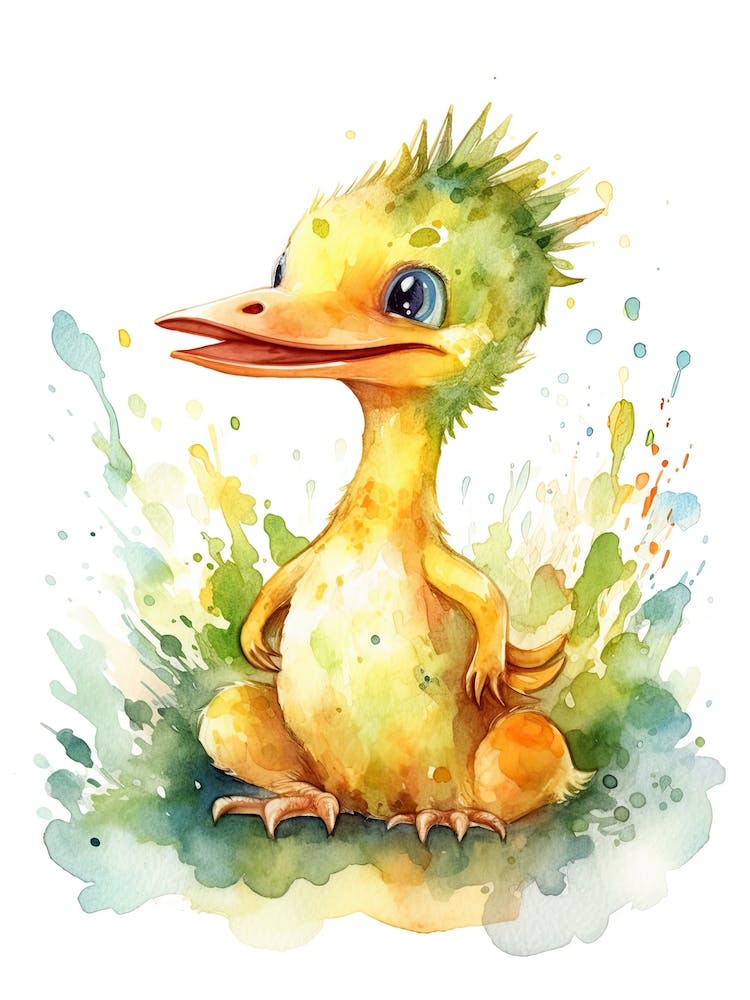 A mischievous Suchomimus dinosaur, rendered in bright, playful watercolors, splashes with joyful abandon. Its vibrant green and yellow hues, combined with wide, curious eyes, bring an infectious energy to the piece. This whimsical illustration sparks imagination, ready to delight young adventurers with its cheerful prehistoric charm.