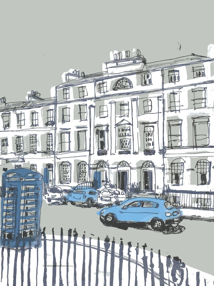 A classic blue telephone box stands sentinel on an Edinburgh street, a small blue car parked nearby. The Georgian architecture behind, rendered in elegant grays and whites, suggests a city steeped in history. This sketch captures the quiet charm of a European urban moment, evoking a sense of calm nostalgia.