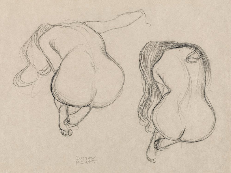 Two intimate studies by Gustav Klimt reveal the graceful contours of a seated nude, her long hair cascading. Rendered in a muted palette of earth tones, these sketches embody a profound elegance and artistic mastery. The quiet intensity and subtle sensuality of the human form are captured with timeless beauty.