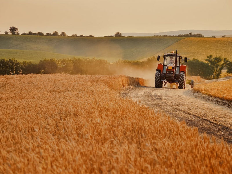 A red tractor works in a golden wheat field, stirring up dust under the warm glow of a setting sun. The rich, earthy tones and expansive landscape evoke a sense of diligent labor and the peaceful, bountiful beauty of a late summer harvest in the countryside. A moment of rural serenity.