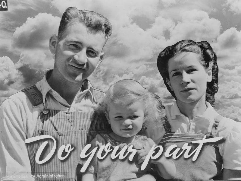 A vintage black and white photograph captures a hopeful farming family, including a young child, beneath a cloudy sky, overlaid with the powerful message to 'Do your part'. This historical image evokes resilience and community spirit, reflecting a call to self-sufficiency and national effort. It's a poignant reminder of past struggles and collective strength.