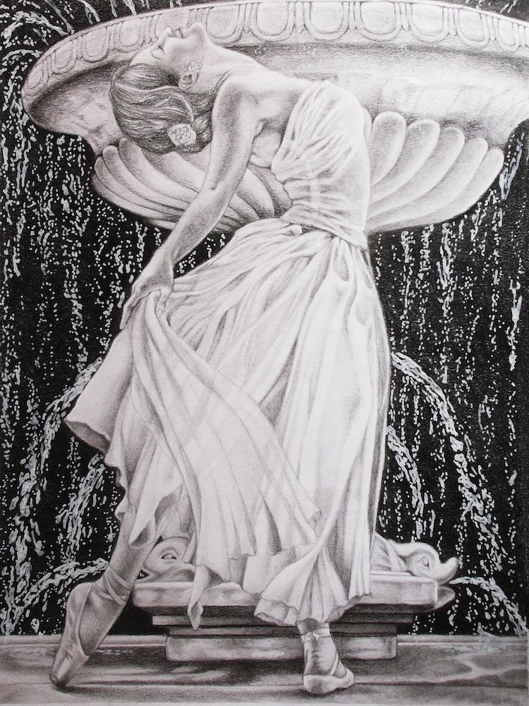 A ballerina, sculpted in graphite, strikes an elegant pose, her form arching gracefully against a backdrop of flowing water. The meticulous pencil work captures both the delicate folds of her dress and the powerful lines of her body, embodying the timeless beauty and strength of classical dance with dramatic intensity.