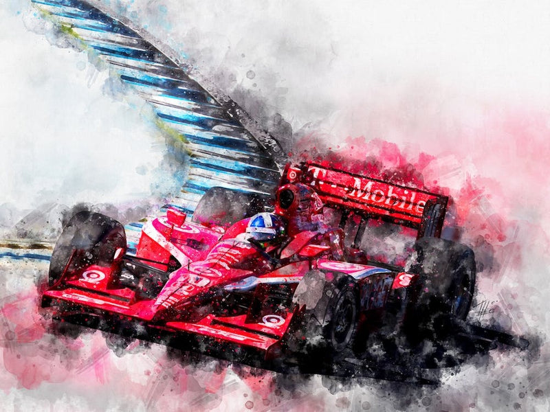 A vivid watercolor captures a red race car in motion, its energy bleeding across the canvas. Splashes of color emphasize speed and the thrill of the track. It's a dynamic freeze-frame, pulsing with adrenaline and the roar of the engine.