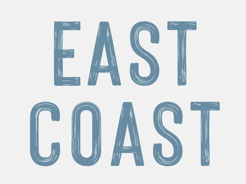 The words "EAST COAST" stand in a distressed, blocky font, rendered in a muted blue-gray against a clean white background. Its simplicity evokes a sense of quiet pride and belonging to a specific region, calling forth images of ocean breezes and rugged shorelines. A subtle, nostalgic charm permeates this minimalist typographic piece.