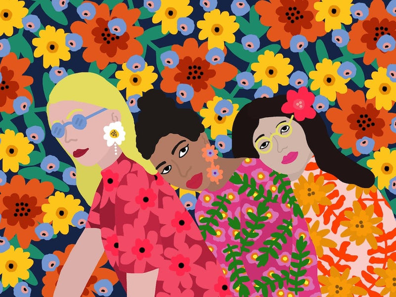 Three women, each unique, stand together, framed by an exuberant explosion of tropical flowers in fuchsia, orange, and yellow. Their presence radiates a powerful message of unity and welcome, "Everybody Is Welcome Here" resonating from the vibrant, patterned background. This digital illustration celebrates diversity with unbridled joy and a warm, inclusive spirit.