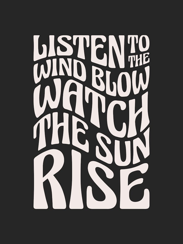 Iconic lyrics from Fleetwood Mac's "The Chain" undulate in a retro, wavy font, bold against a stark black backdrop. "Listen to the wind blow, watch the sun rise"—a powerful call to presence and connection. This graphic piece channels a nostalgic energy, perfect for music lovers and those embracing a vintage vibe.