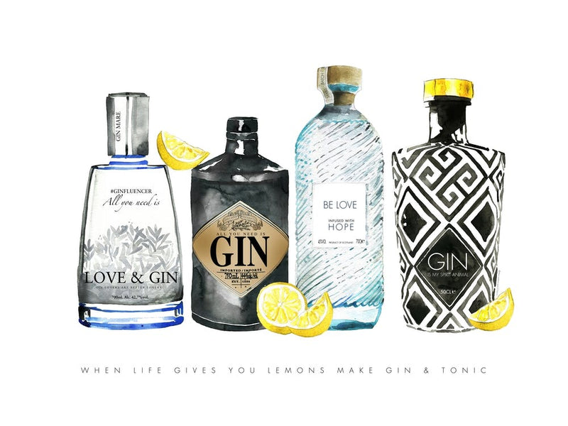 A quartet of elegant gin bottles, some adorned with intricate labels, stand beside bright, fresh lemon slices. Rendered in a delicate watercolor style, the bottles hint at artisanal craft, while the lemons add a zesty, refreshing accent. This artwork evokes the sophisticated simplicity of a classic gin and tonic, perfect for a curated bar or kitchen.