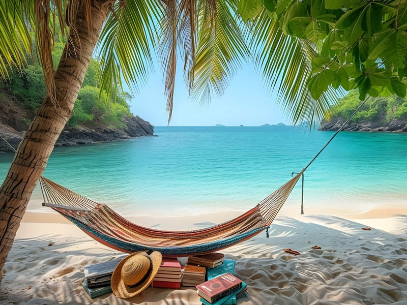 A inviting hammock sways gently between two palm trees on a pristine white sand beach, overlooking a serene turquoise cove. Lush green islands frame the distant horizon under a clear blue sky. It's an idyllic snapshot of perfect tranquility, a dreamscape of escape, inspiring ultimate relaxation.