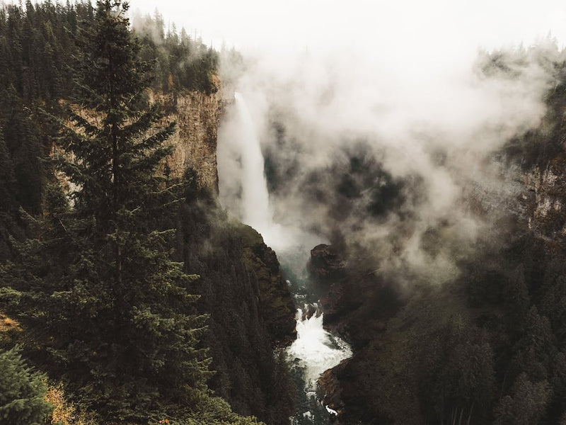 A powerful waterfall plunges through a mist-shrouded forest, its roar softened by the damp air. Towering evergreens frame the ethereal scene, cloaked in hues of deep green and atmospheric gray. This image captures nature's raw beauty and tranquil power, evoking a sense of calm and ancient mystery.