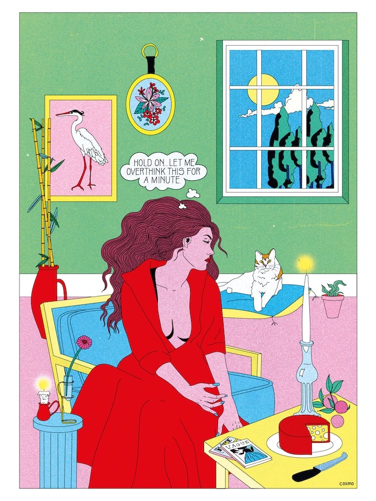 A woman in crimson sits immersed in thought, a silent query hanging in a playful bubble. Beside her, a calm cat observes the moonlit scene outside a window. The room, a vibrant medley of green and pink, holds familiar comforts and a sense of introspective pause, inviting the viewer into a moment of delightful contemplation.