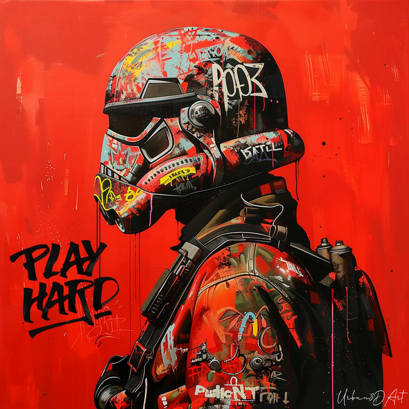 A stormtrooper helmet bursts with vibrant street art, splattered with dynamic graffiti and bold colors against an intense red backdrop. Words like "PLAY HARD" reinforce its rebellious energy. It's a powerful fusion of pop culture and urban expression, raw and captivating.