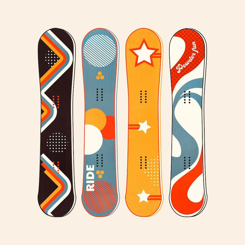 Four distinct retro snowboards stand in a vibrant line, each adorned with bold geometric patterns and playful typography. A palette of warm oranges, cool teal, and earthy browns evokes a distinctly 80s-90s aesthetic. It's a joyful burst of nostalgic sports culture, capturing the fun and style of past winter adventures.