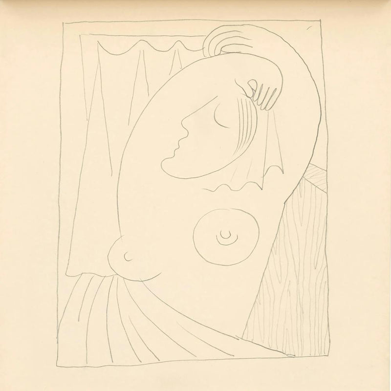 A stark, minimalist line drawing by Mikuláš Galanda depicts a female figure seated on a toilet, rendered with a bold, abstract simplicity. The contours of the body and the object merge into a powerful, almost cubist form against a pale background. This piece, with its directness and absence of adornment, challenges conventional art, inviting reflection on daily life and the human form.