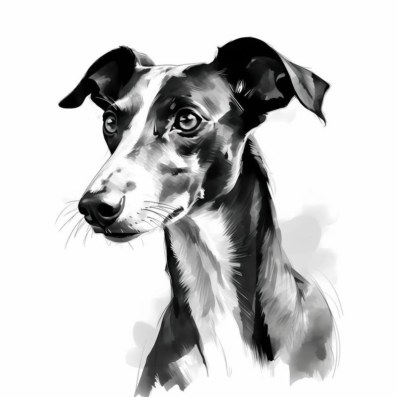 A sleek greyhound gazes with quiet intensity, its graceful form rendered in elegant black and white strokes. The minimalist composition highlights the animal's inherent nobility and subtle strength. This drawing captures a profound connection to nature, a timeless portrayal of canine beauty.