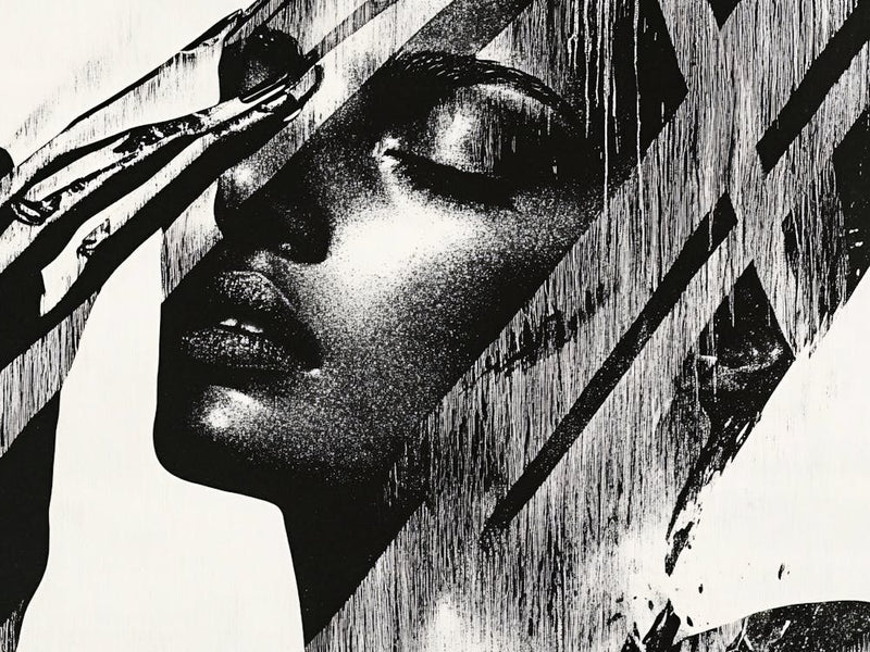 A woman's face emerges from a stark interplay of black ink and white space, fragmented and reshaped by bold, intersecting lines. This drawing commands attention with its dramatic contrast and modern graphic sensibility, transforming a classic portrait into a powerful statement. It's a visually compelling piece that redefines beauty through abstraction.