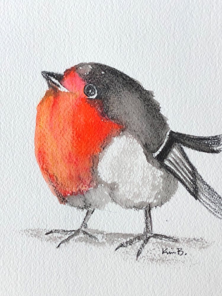 A plump, round bird with a bright red breast gazes upwards, its form rendered in charming, soft watercolors. The simple lines and gentle colors evoke a sense of innocence and playfulness, perfectly capturing a moment of avian curiosity.