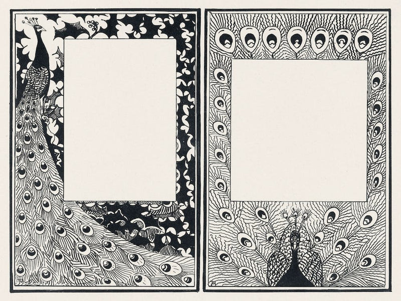 Intricate peacock designs frame a blank space, rendered in classic Art Nouveau style by Theo Van Hoytema. Delicate floral patterns intertwine with the majestic birds, creating a timeless, elegant aesthetic. The monochrome palette accentuates the detailed linework, evoking a sense of historical artistry and refined charm.