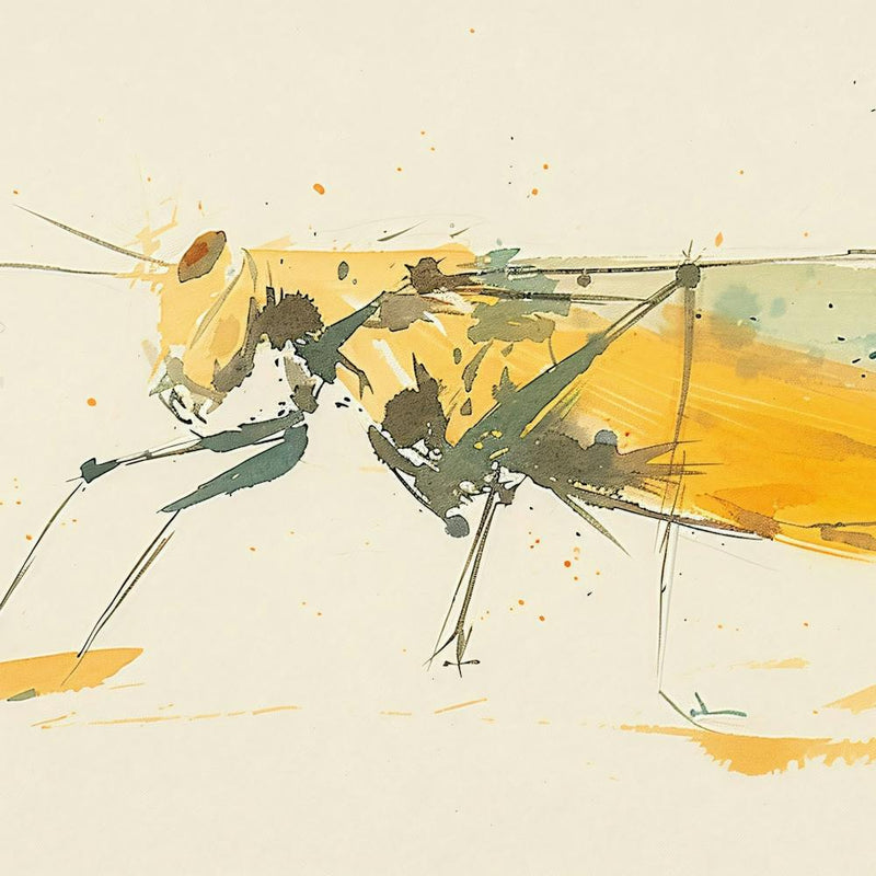 A stylized grasshopper, rendered in loose, expressive watercolor strokes, dominates the frame, with faint outlines of flies suggesting their presence. Splashes of yellow, green, and brown create a vibrant yet organic feel. This artwork offers a whimsical, artistic interpretation of the insect world, celebrating the overlooked beauty of nature's small creatures.