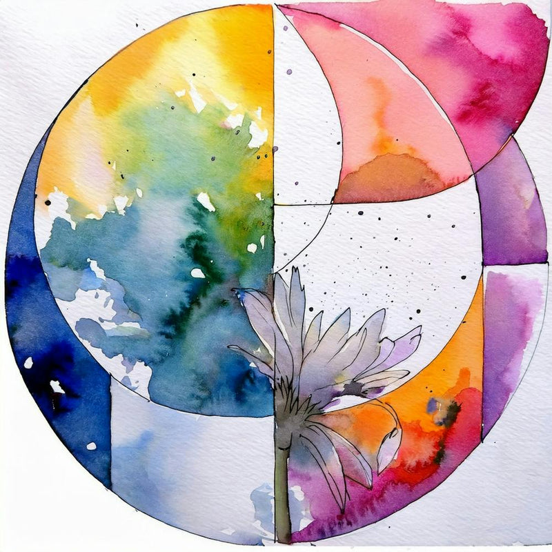 A dynamic circle explodes with a spectrum of watercolor hues—blues, yellows, and pinks—bleeding into one another like a kaleidoscopic dream. A delicate flower emerges from the vibrant chaos, blending organic form with bold geometric abstraction. This piece pulses with playful energy, a joyful expression of color and motion.