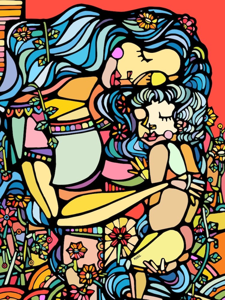 Vibrant, intricate lines weave together, forming a protective embrace between mother and child, reminiscent of stained glass. A kaleidoscope of colors and hidden floral motifs pulsate with deep love and warmth, capturing a powerful, timeless bond.
