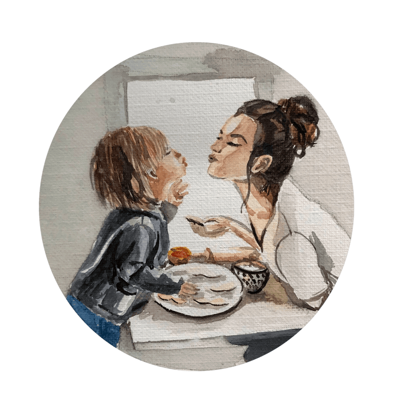 A tender moment unfolds in soft watercolor, depicting a mother gently feeding her child. The light strokes capture the intimate bond and warmth shared between them, with muted tones creating a serene, loving atmosphere. This artwork celebrates the quiet beauty of everyday family life.