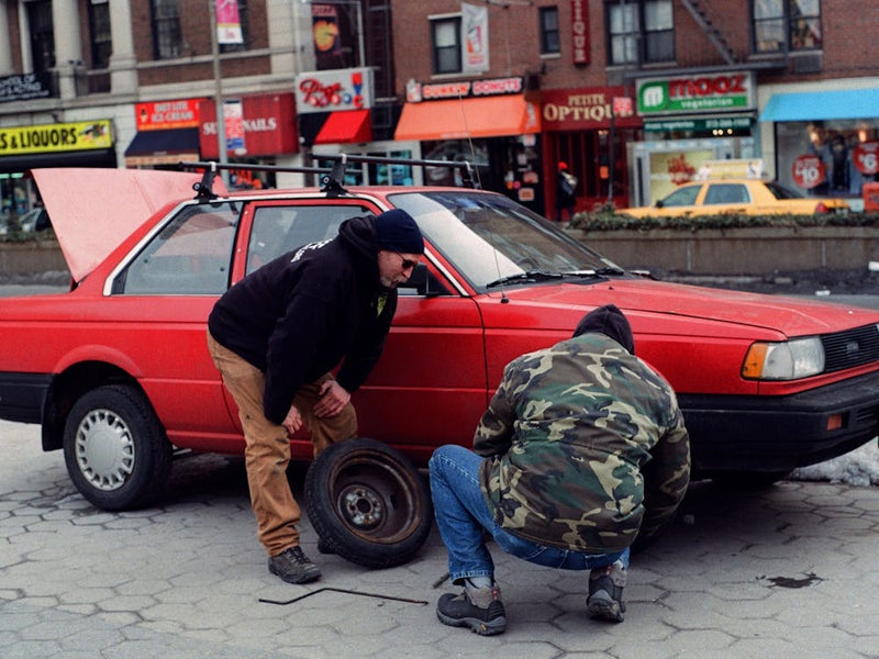 Two men attend to a red car, its hood open, amidst the bustling backdrop of a city street. The scene captures a candid moment of urban life, with the grit of the street and the hint of everyday challenges. It's a snapshot of human interaction against a vibrant metropolitan pulse, full of quiet determination.