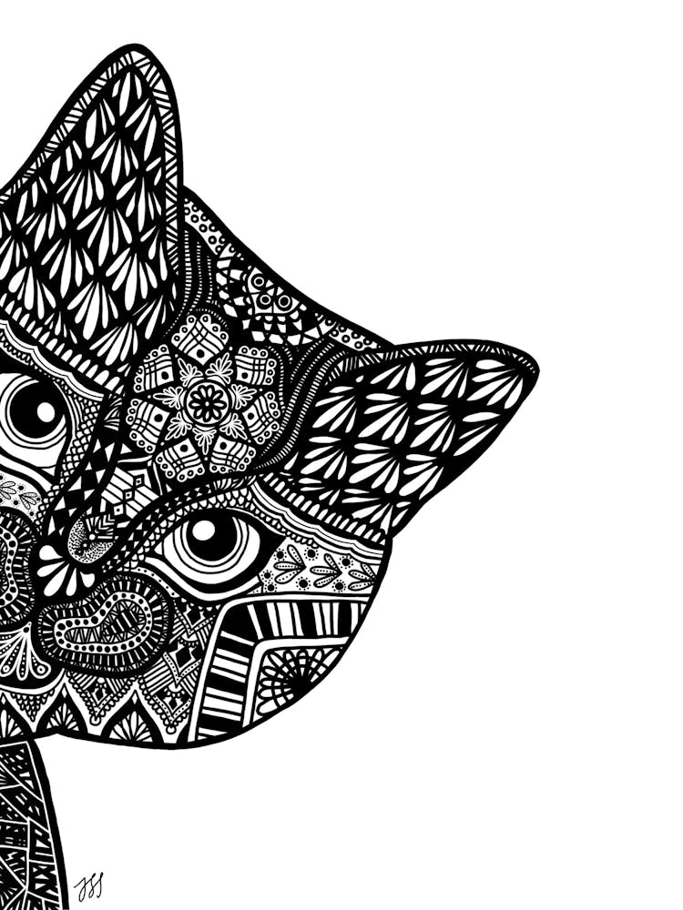 An intricately patterned cat, rendered in a mesmerizing black and white mandala style, playfully peeks into view, its eyes sparkling with curiosity. Every line and curve is a testament to detailed craftsmanship, creating a visual pulse that is both calming and engaging. This artwork captures the whimsical spirit of a feline friend, offering a unique blend of artistry and charm.