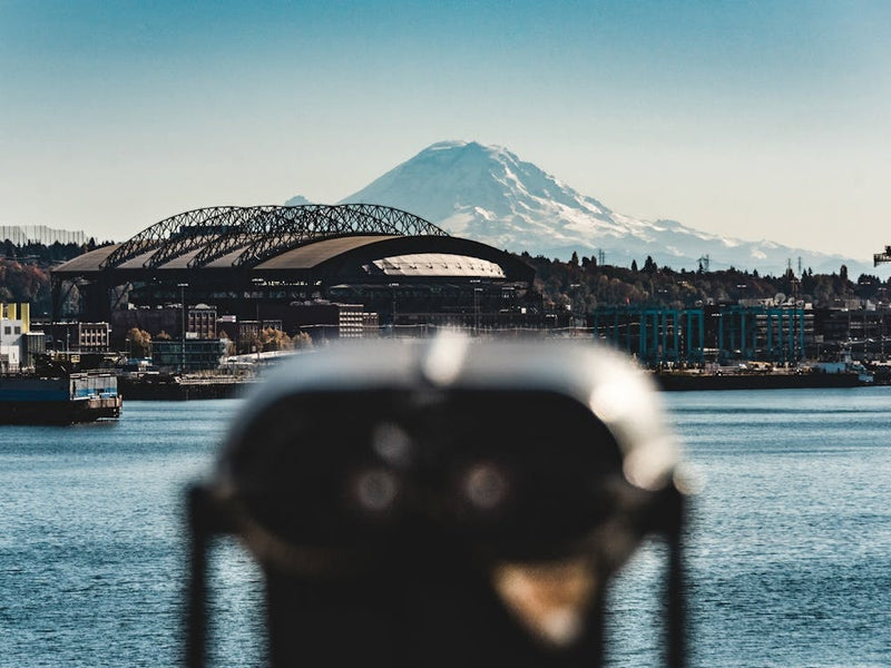 From a waterfront vantage, Seattle’s skyline and the iconic Lumen Field rise beneath the majestic, snow-capped Mount Rainier. A coin-operated binocular station in the foreground hints at discovery. The clear blue sky and calm waters convey the crisp beauty of a summer day, inviting contemplation and wonder.