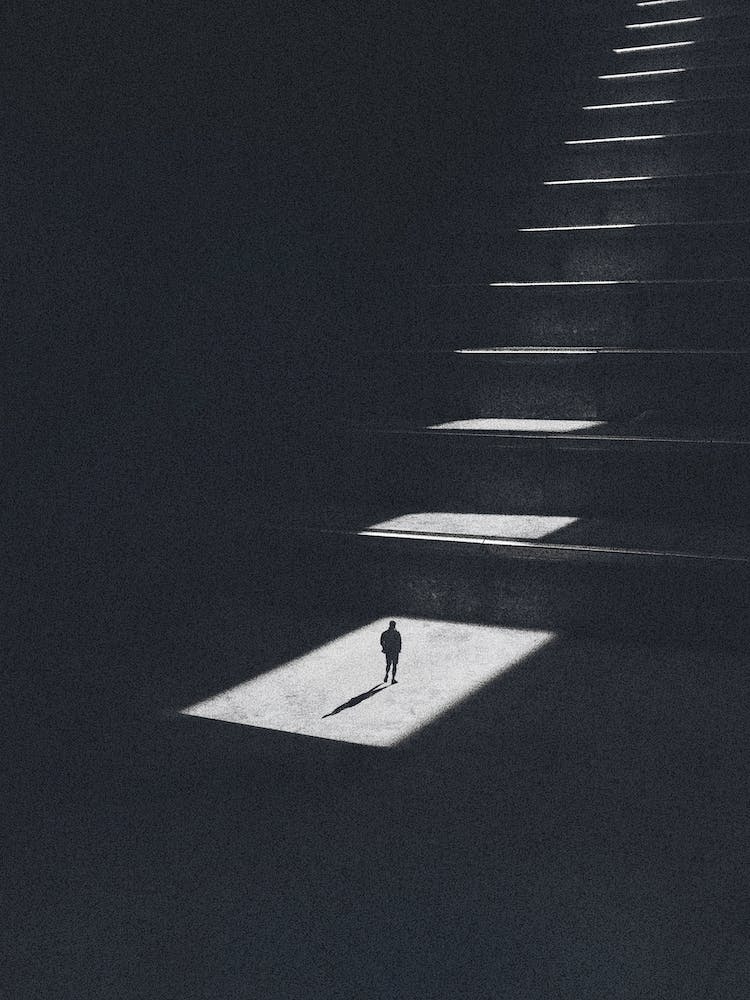 A solitary figure stands illuminated in a stark rectangle of light, casting a long shadow across a vast, dark staircase. The powerful contrast of light and engulfing shadow evokes themes of introspection, journey, and the individual's path. This minimalist piece is both dramatic and deeply thoughtful.