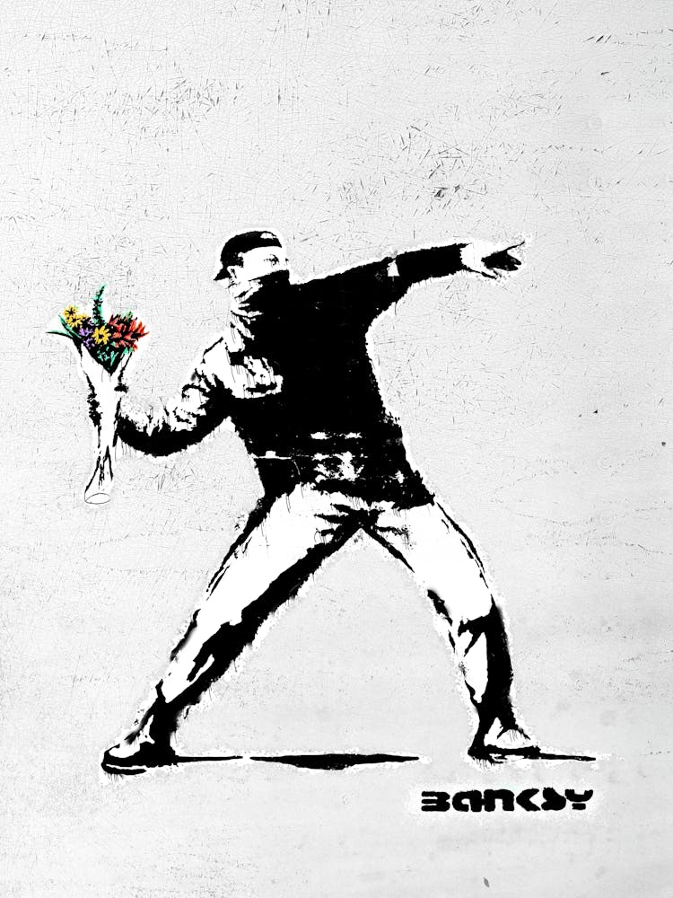 An iconic stencil figure, dressed in riot gear, hurls a vibrant bouquet of flowers with determined force, transforming an act of aggression into a gesture of peace. The stark black and white contrasts powerfully with the colorful blossoms, creating a poignant statement on protest and hope. It’s a bold, thought-provoking symbol of peace in defiance.