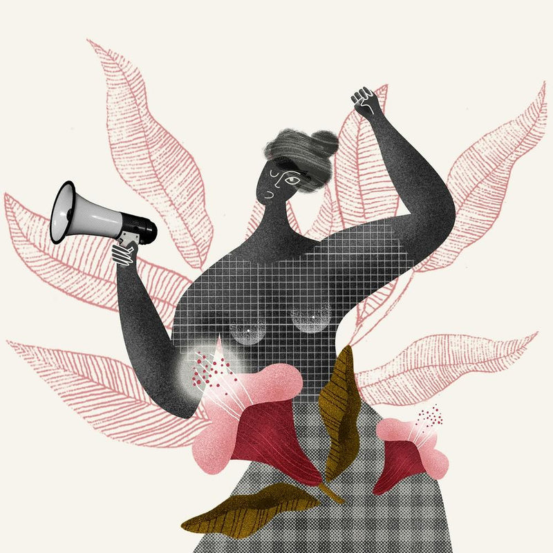 A stylized figure, powerful and resolute, raises a megaphone amidst a swirl of delicate pink and green botanical forms. Her presence, rendered in textured dark gray and subtle patterns, is a beacon of strength and advocacy. The artwork pulses with an empowering message, celebrating female resilience and the call for justice. It’s a bold, culturally aware piece that inspires and resonates with contemporary movements for change.