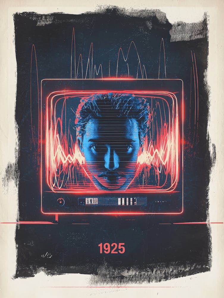 A spectral face emerges from the glowing screen of an old television set, enveloped in pulsating neon red lines. The dark, textured backdrop and the date "1925" evoke a vintage yet unsettlingly futuristic tone, hinting at early broadcast mysteries. It's a striking blend of retro tech and psychological intrigue.