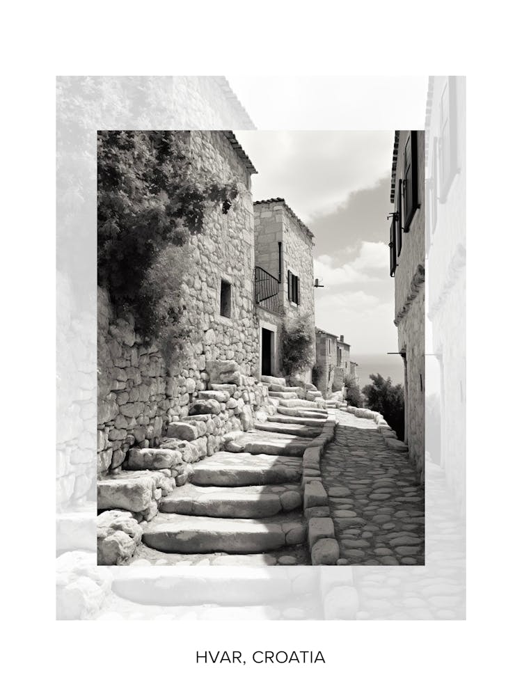 A winding cobblestone street in Hvar, Croatia, is bathed in timeless black and white, flanked by ancient stone buildings. The image exudes a nostalgic charm, inviting a journey through history and sun-drenched alleys. Its stark contrasts and rich textures capture the quiet beauty and enduring spirit of a historic Mediterranean village.